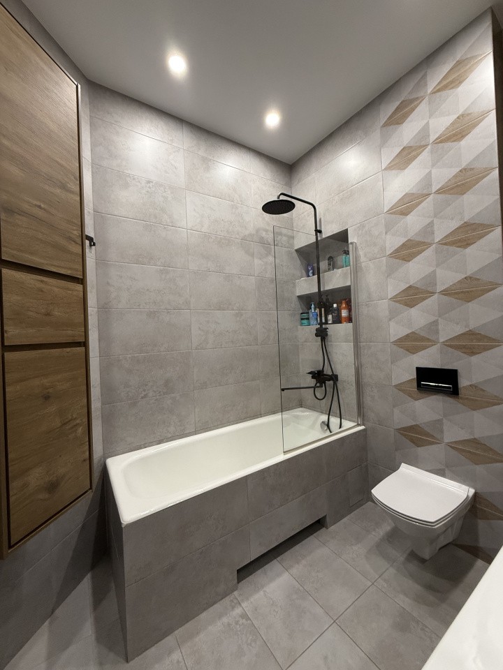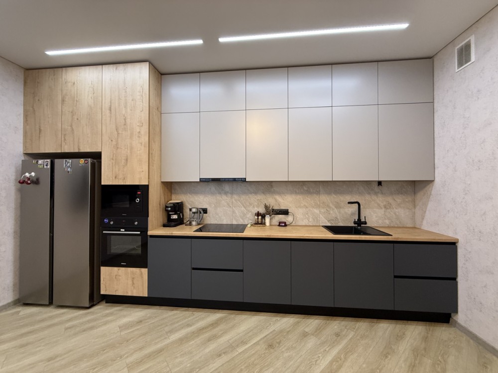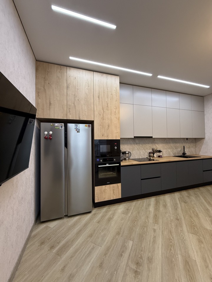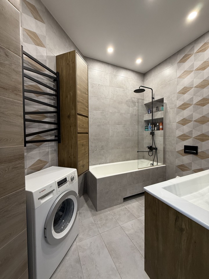 Остаётся кухонный гарнитур со встроенной техникой (посудомоечная машина, варочная поверхность, духовой шкаф, вытяжка, свч-печь), холодильник, система хранения в прихожей, шкаф-купе в спальне, мебель в ванной, стиральная машина, светильники, гардины и шторы во всей квартире.
